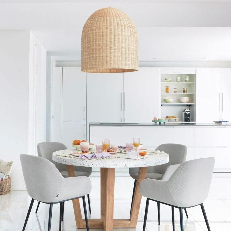 L’abat-jour Druciana se prête à de nombreuses mises en scène. Suspendu au-dessus d’une table à manger, il structure l’espace sans l’alourdir. Dans un coin lecture, il diffuse une lumière douce qui invite à la détente. Associé à des luminaires à cordon discret ou à une suspension en métal patiné, il crée un contraste élégant entre naturel et contemporain.