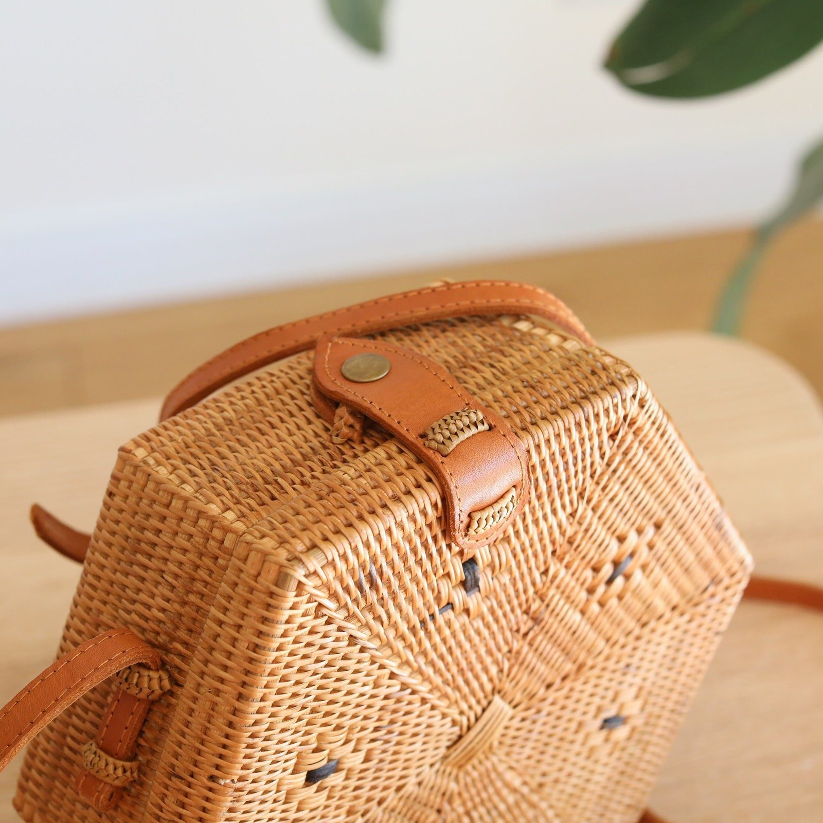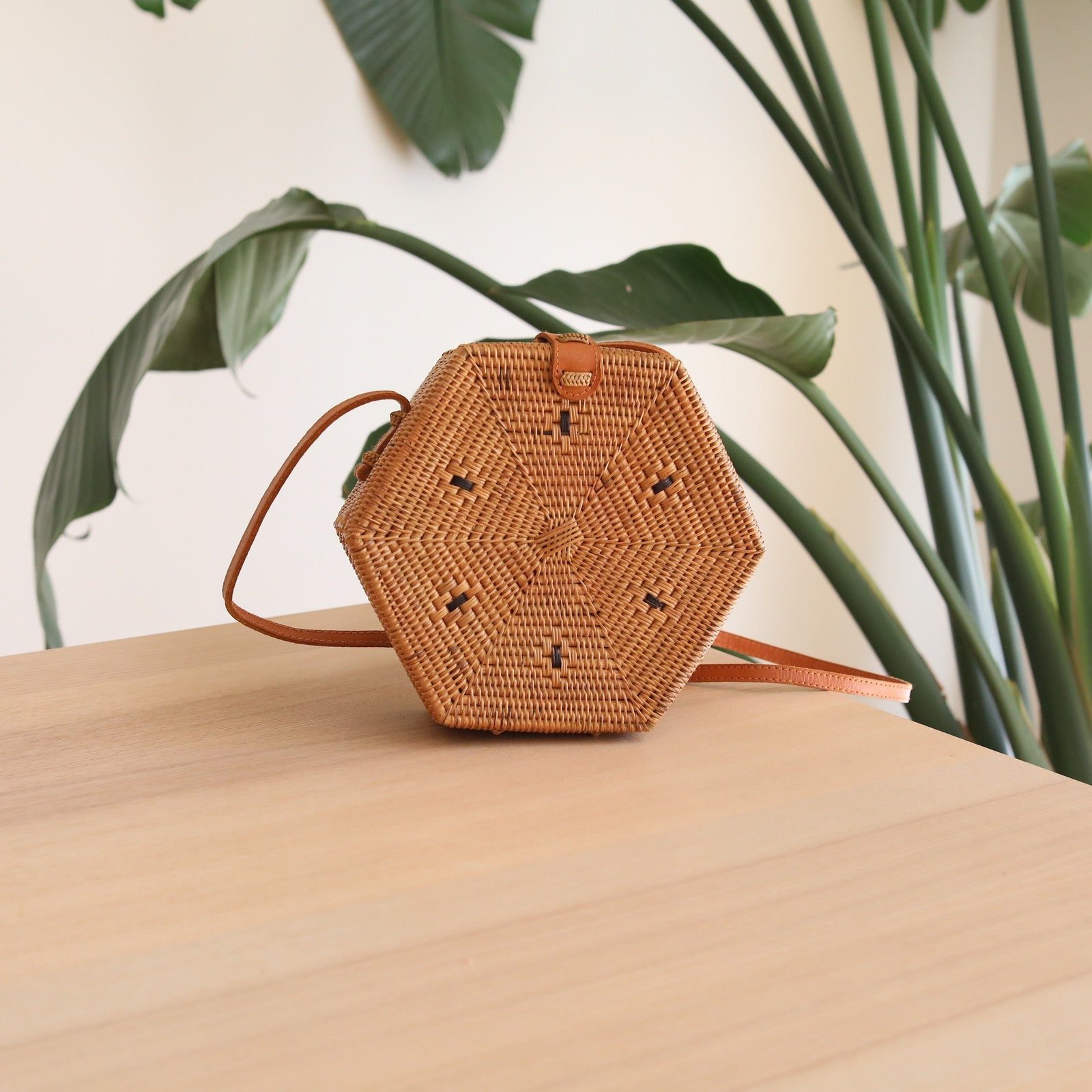 Sac bandoulière hexagonal en rotin Ata — Élégance bohème de Bali