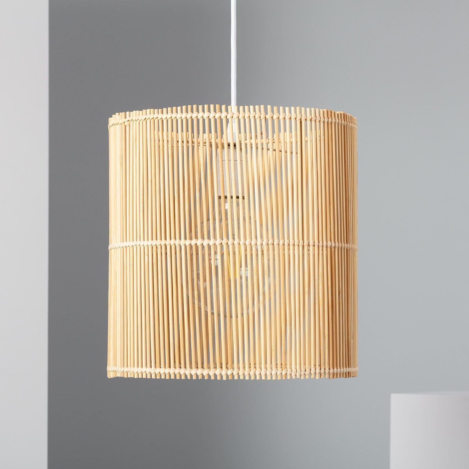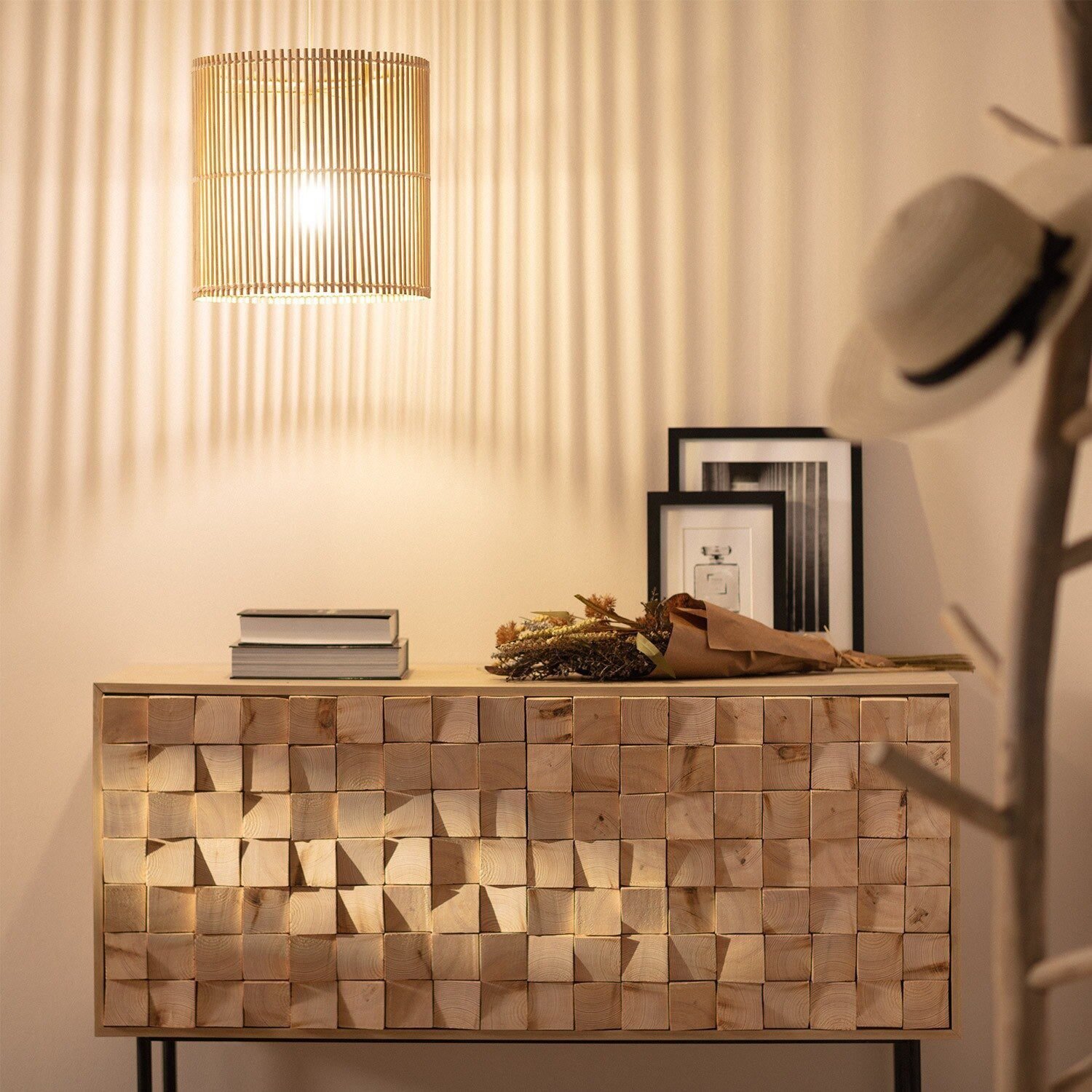 - Lumière douce : L’abat-jour en rotin diffuse une lumière subtilement tamisée, parfaite pour créer une ambiance cosy.