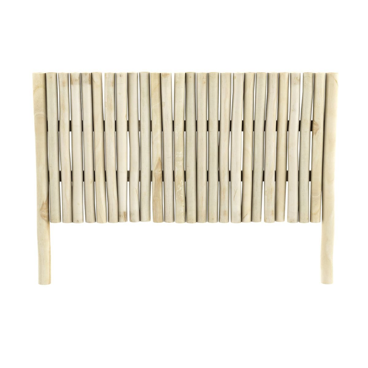 Fabriquée en branche de teck, cette tête de lit met en valeur le veinage et les nuances propres au bois exotique. La structure évoque une palissade verticale qui habille le mur d’une présence graphique et chaleureuse. Les variations de teintes naturelles participent au charme du modèle et créent un rendu unique, à la fois sobre et plein de caractère.